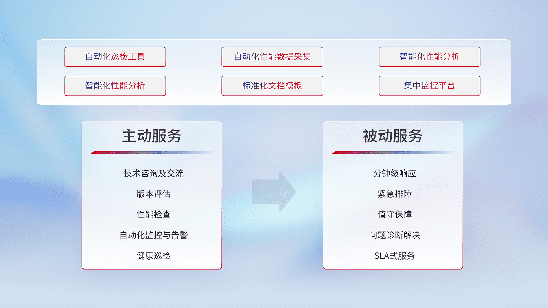 智能化工具和标准化文档,,保障服务质量,,,提供主动服务(包含技术咨询、、版本评估、、、性能检查、、、、自动化监控与告警、、健康巡检)和被动服务包含(分钟级响应、、、、紧急排障、、、、值守保障、、问题诊断解决、、、SLA服务)。。。