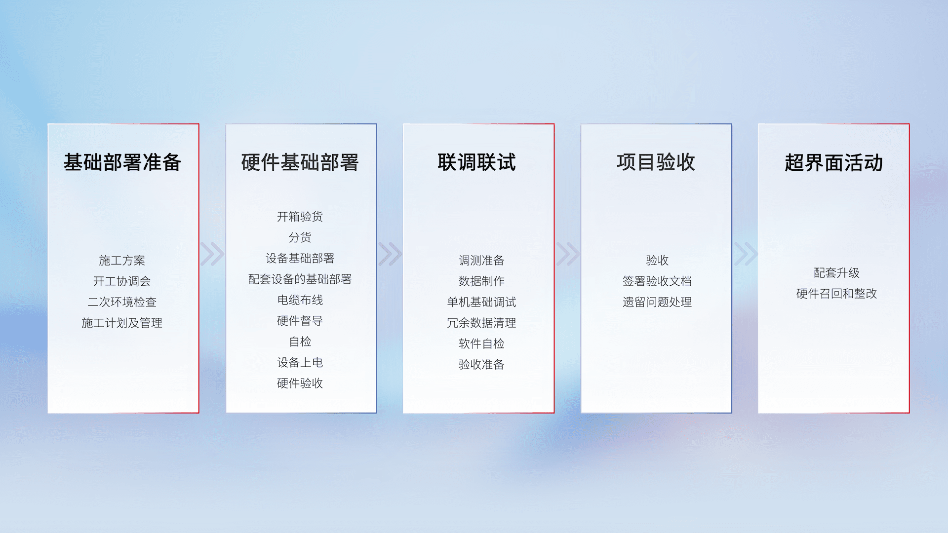 从基础部署准备、、硬件基础部署、、、、联调联试、、项目验收、、越界面活动的全过程可追溯,,,保证施工质量和进度。。。
